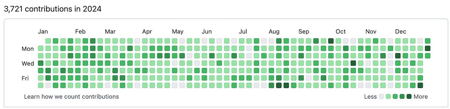 As 2024 drew to a close, I reflected on my coding journey. Leading PolicyEngine meant less time programming, but I still maintained 3,721 GitHub contributions last year (down from ~4,500 in prior years), spanning collaborations, third-party contributions, and personal projects.