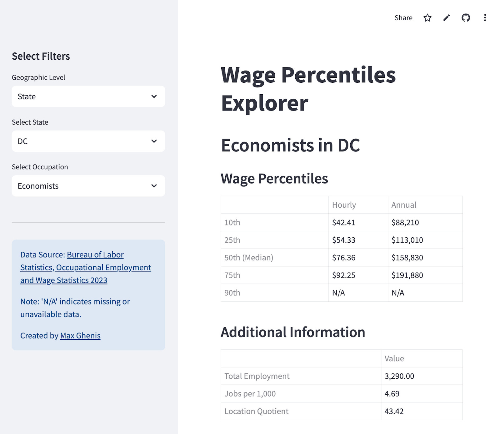 oews-explorer.streamlit.app helps explore the Bureau of Labor Statistics Occupational Employment and Wage Statistics by occupation and geography. I built it to support PolicyEngine's NSF grant application, but it's also useful for compensation research.