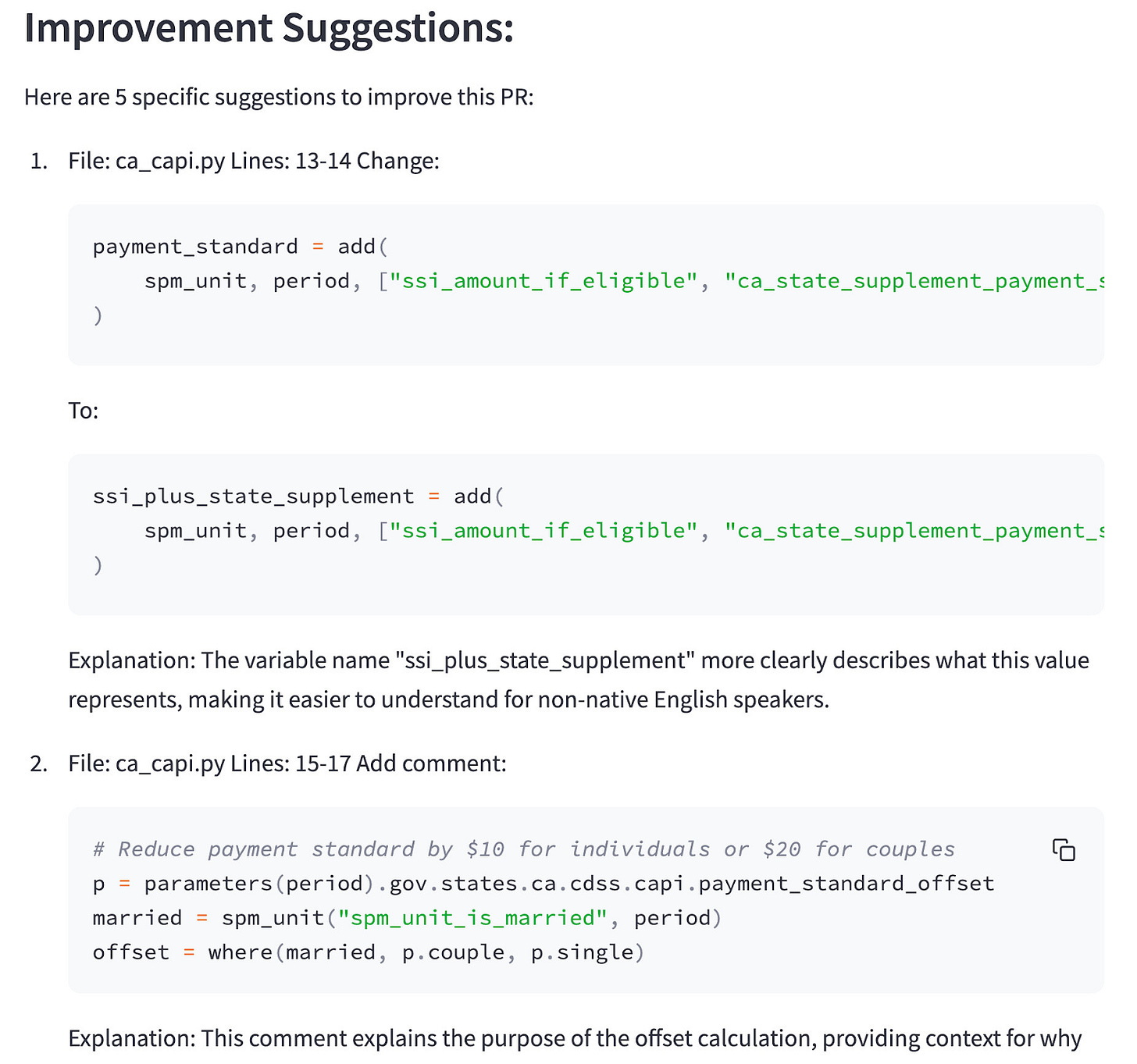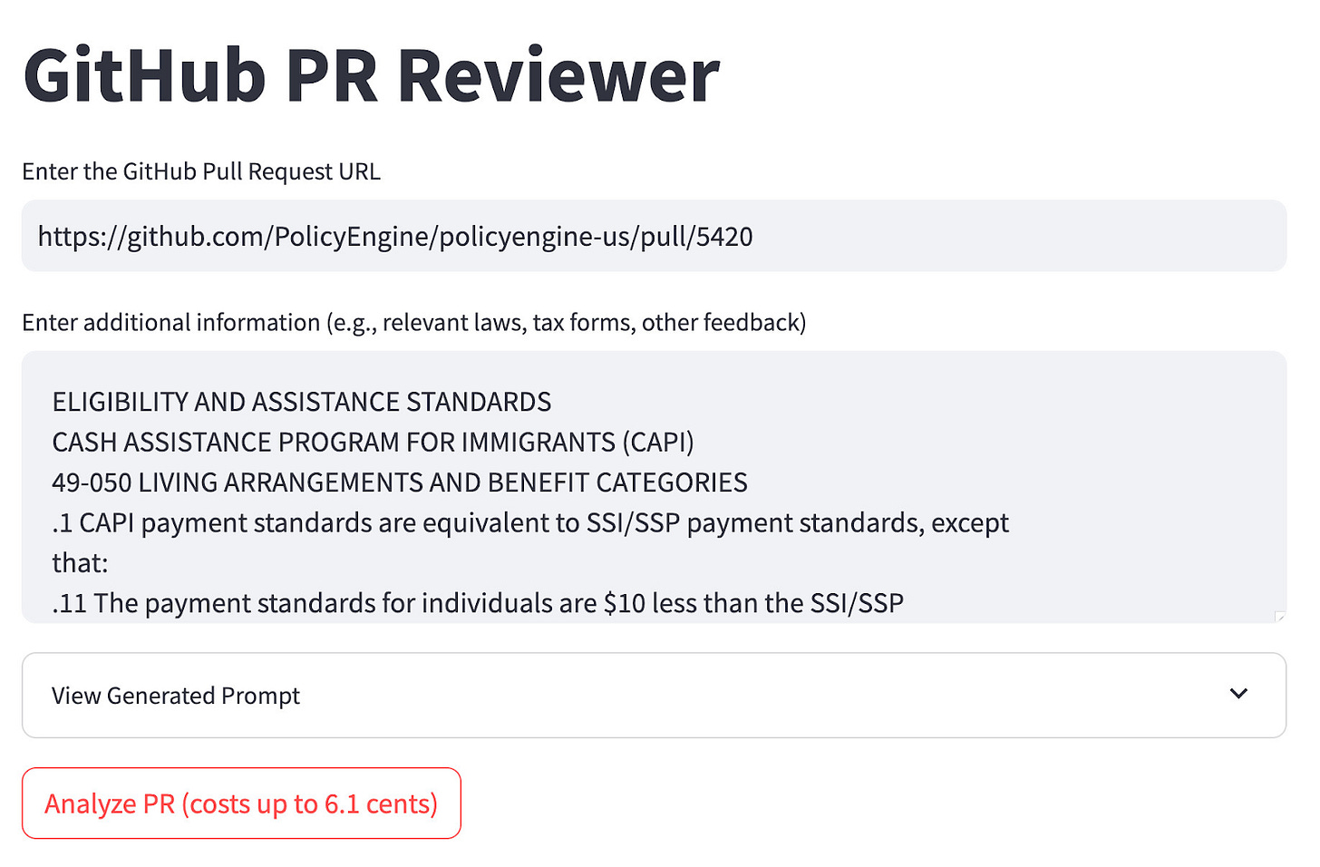 pr-improver.streamlit.app suggests improvements to pull requests using LLMs and the GitHub API, comparing against contributor guidelines in the repo. While it currently only works with PolicyEngine repos (since each run costs us money), I'm planning to add support for other repos where you can bring your own LLM API key.